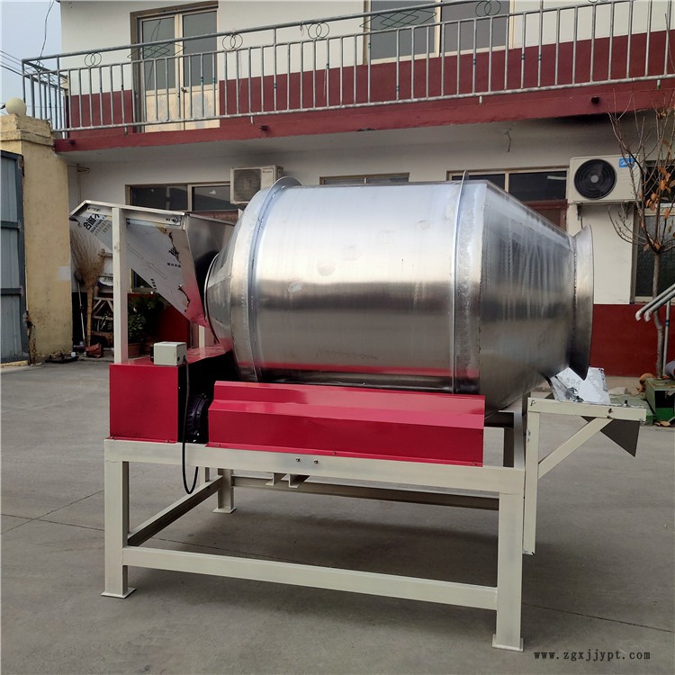 滾筒拌料機適應比較廣,能夠把產品放在一起攪拌混合均勻,產量高,速度快。本機混料速度快;全自動操作簡單,方便自如,自動出料,勞動強度低;獨有的旋齒排列形式使物料混合更均勻,單次裝料量更多;大型攪拌機的密封保護使設備使用壽命更長,清洗更方便。對粒狀、粉狀、泥狀、糊狀、漿狀物都有很好的適應性和混合效果,對塊狀物有較好的保型性,具有正反轉功能,自動上料,自動出料功能。