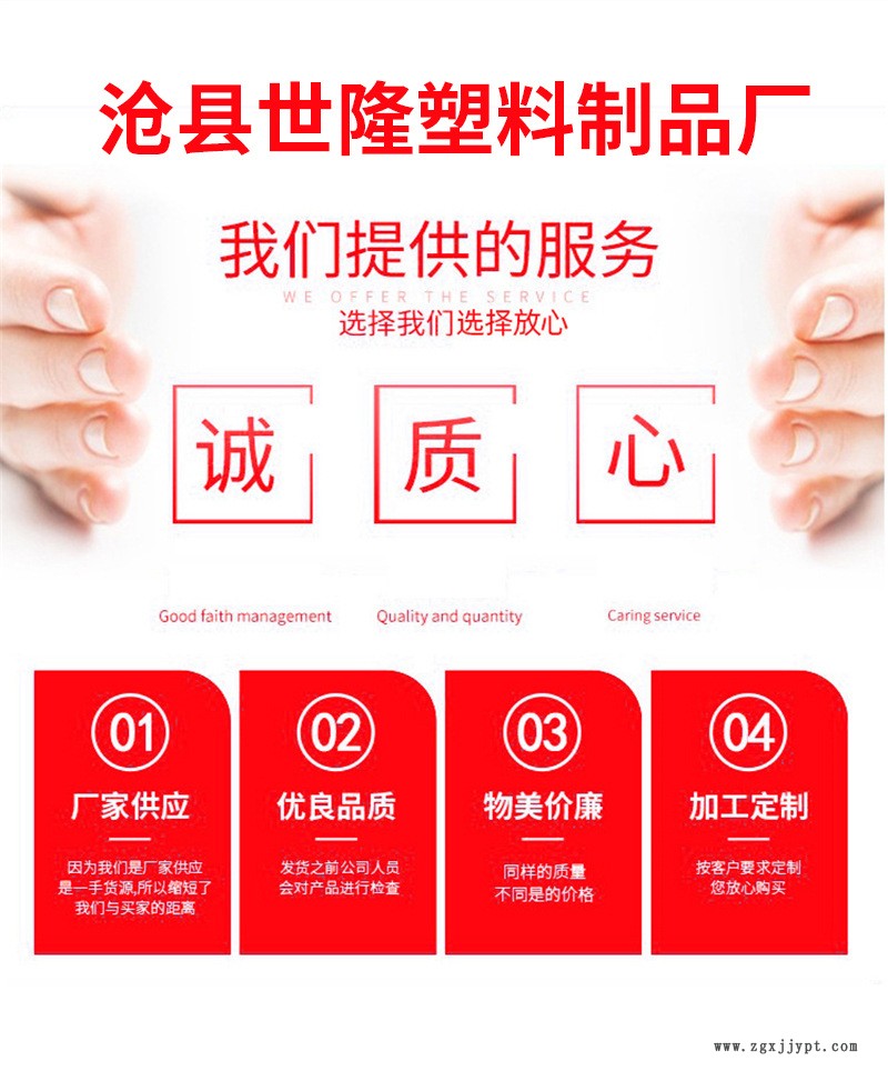 滄縣世隆塑料制品廠是生產(chǎn)銷售塑料制品等產(chǎn)品生產(chǎn)加工的公司,擁有完整、科學(xué)的質(zhì)量管理體系滄縣世隆塑料制品廠的誠信、實(shí)力和產(chǎn)品質(zhì)量獲得業(yè)界的認(rèn)可。歡迎各界朋友蒞臨參觀、指導(dǎo)和業(yè)務(wù)洽談。 自公司成立以來,本著“質(zhì)量為先,服務(wù)為本”的經(jīng)營理念,服務(wù)于新老客戶,獲得新老客戶的 一致好評(píng),現(xiàn)已擁有完整的線上線下銷售渠道,擁有完整、科學(xué)的質(zhì)量管理體系,所生產(chǎn)的產(chǎn)品銷往各國各地。始終堅(jiān)持“誠信、品質(zhì)、創(chuàng)新、服務(wù)、速度”十字經(jīng)營方針, 對(duì)待客戶、合作伙伴堅(jiān)持誠信為先,我們要為客戶不斷提供高品質(zhì)的產(chǎn)品和及時(shí)周到的服務(wù),并不斷創(chuàng)新,提高我們的服務(wù)能力,在此基礎(chǔ)上不斷地優(yōu)化我們的組織結(jié)構(gòu)和工作流程,使我們的企業(yè)健康成永續(xù)經(jīng)營。