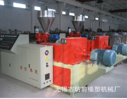 該機(jī)組由錐形雙螺桿擠出機(jī)、真空定型臺、牽引機(jī)、切割貼膜機(jī)、翻料等組成,可以根據(jù)不同型材斷面及模具,選用不同規(guī)格的錐形雙螺桿擠出機(jī)。