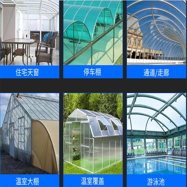 園林、游藝場(chǎng)所奇異裝飾及休息場(chǎng)所的廊亭;商業(yè)建筑的內(nèi)外裝飾、現(xiàn)代城市樓房的幕墻;航空透明集裝箱、飛機(jī)、火車、輪船、汽車、汽艇、潛艇及玻璃;電話亭、廣告路牌、燈箱廣告、展示展覽的布置;儀器、儀表、高低壓開(kāi)關(guān)柜面板及軍事工業(yè)等;壁、頂、屏風(fēng)等室內(nèi)裝飾材料;高速公路及城市高架路隔音屏障;農(nóng)業(yè)溫室及養(yǎng)殖大棚;現(xiàn)代生態(tài)餐廳頂棚;所有單位或小區(qū)內(nèi)自行車棚、陽(yáng)臺(tái)遮陽(yáng)雨棚及屋頂休息亭棚;辦公樓、百貨大樓、賓館、別墅、學(xué)校、醫(yī)院、體育場(chǎng)館、娛樂(lè)中心及公用設(shè)施的采光頂棚等.