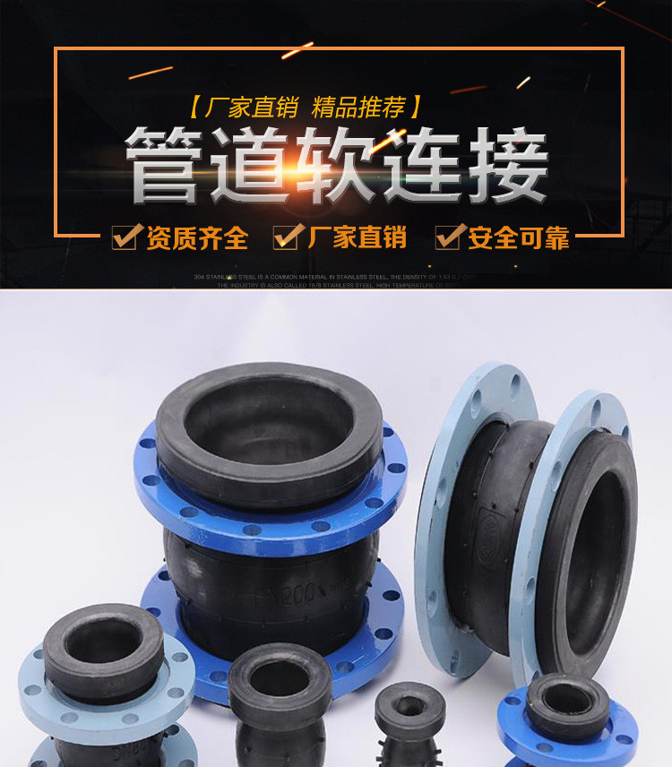 橡膠軟接頭又稱可曲撓單球體橡膠接頭,橡膠柔性接頭,軟接頭,減振器、管道減震器、避震喉等,是一種高彈性、高氣密性,耐介質(zhì)性和耐氣候性的管道接頭。該產(chǎn)品利用了橡膠的彈性、高氣密性、耐介質(zhì)性、耐候性和耐輻射性等有點(diǎn),采用高強(qiáng)度、冷熱穩(wěn)定性強(qiáng)的聚酯簾子布斜交與之復(fù)合后,經(jīng)過(guò)高壓、高溫模具硫化而成。為防止該產(chǎn)品在長(zhǎng)期使用中自然萎縮和減少老化破裂,采用網(wǎng)狀鋼絲進(jìn)行多體保護(hù)。橡膠軟接頭是由內(nèi)外層膠、簾布層和鋼絲圈組成管狀橡膠件,經(jīng)硫化成型后再與金屬法蘭或平行接頭松套組合而成。此產(chǎn)品可降低振動(dòng)及噪聲,并可對(duì)因溫度變化引起的熱脹冷縮起補(bǔ)償作用,廣泛應(yīng)用于各種管道系統(tǒng)。與泵、閥門的連接、消防器材,震動(dòng)較大的管道、冷熱變化頻繁的管道。主要用于原水和污水的提升和輸送,火力發(fā)電廠的給水和冷卻循環(huán)水,冶金行業(yè),冷凝水,化工行業(yè)的化學(xué)物質(zhì)的管道輸送,石化行業(yè)的冷卻,稀釋及其它行業(yè)長(zhǎng)短距離管線間的柔性連接。因?yàn)橄鹉z具有較高的耐磨性,還適用于一切行業(yè)的粒狀和粉狀及汽體的低溫輸送。