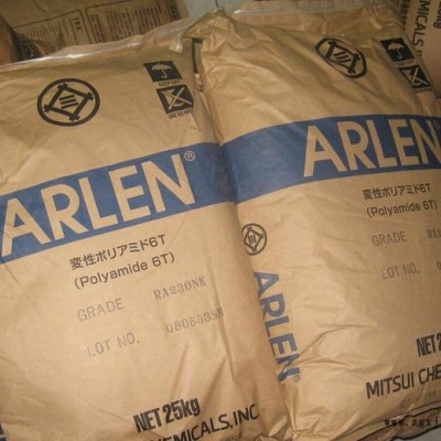 全稱聚對苯二甲酰己二胺,ARLEN™為日本三井化學(xué)公司(MitsuiChemicals,Inc)所開發(fā)出的一種耐熱性尼龍6T/66,是一種PA6TPA6T與PA66共聚的產(chǎn)物。其電子零件用的PA6T/66為一種基于對苯二甲酸,己二酸及己二胺的改質(zhì)尼龍6T,其熔點(diǎn)高達(dá)310℃。PA6T/66的主要特性為優(yōu)異的高溫剛性,尺寸安定性以及耐化學(xué)品性。優(yōu)異的特性使PA6T在許多領(lǐng)域包括汽車零件,機(jī)械零件以及電氣/電子零件上有廣泛的應(yīng)用。