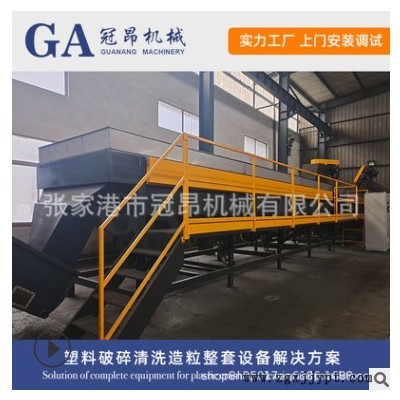 原料先由開包預(yù)清洗機(jī)將均勻的通過輸送機(jī)送入破碎機(jī),破碎成Φ80㎜左右,流入摩擦清洗機(jī)作第二次清洗。當(dāng)物料通過摩擦清洗機(jī)清洗后進(jìn)入高溫蒸煮鍋,使PE料中的油污雜質(zhì)在該機(jī)中充分脫離并流入分離沉淀箱中,在沉淀箱內(nèi)部滾輪地作用下PE物料不斷地得到漂洗。同時(shí)隨水流溢出由設(shè)在沉淀箱端部的網(wǎng)式輸送機(jī)送入離心機(jī)。物料離心脫水后通過風(fēng)機(jī)送入管道式干燥機(jī),然后經(jīng)過旋風(fēng)分離進(jìn)入集料倉(cāng),再通過平帶上料系統(tǒng)送到雙階式擠出造粒機(jī)進(jìn)行擠出造粒。