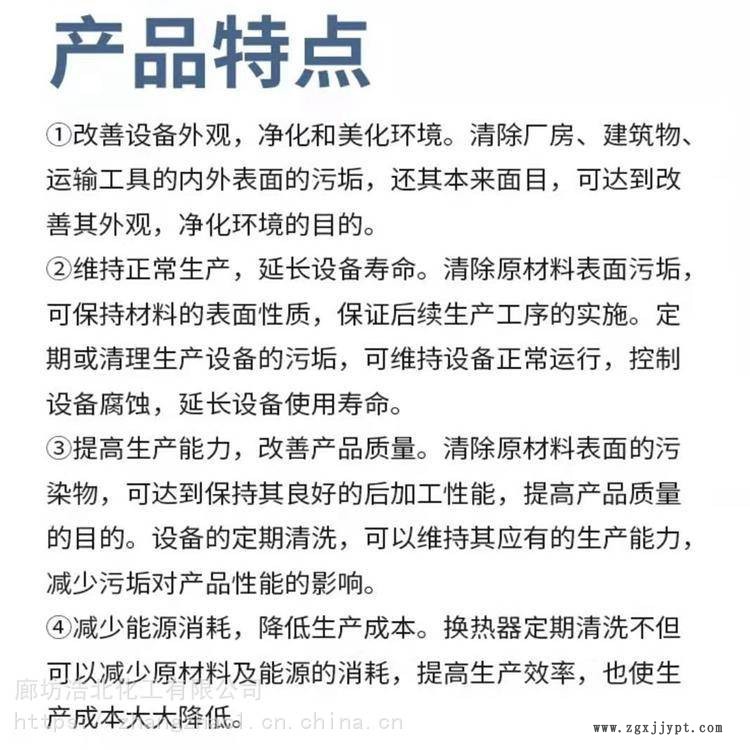 換熱片清洗劑 換熱器的熱交換效率,板式換熱器內(nèi)部由好多不銹鋼板片加膠條壓制在一起,在同張板的兩面熱水和冷水進(jìn)行熱傳遞。當(dāng)板片的一面或者兩面因長期使用其表面附著了大量的水垢或者贓物,直接降低了板換的傳熱效率,導(dǎo)致暖氣側(cè)供水溫度降低。換熱片清洗劑采用 全有螯合清洗技術(shù),快速完成除銹清洗,腐蝕率遠(yuǎn)低于常規(guī)酸洗,徹底摒棄目前普遍使用的強(qiáng)酸性清洗劑對設(shè)備系統(tǒng)金屬的化學(xué)腐蝕和電化學(xué)腐蝕損傷。本品含有 螯合除銹劑、有機(jī)催化劑、高分子滲透劑、反應(yīng)促進(jìn)劑,除油、除銹效率高,清洗后板片與新片無異,光亮如新。本品無刺激性氣味,對人身無損害。對環(huán)境無污染。操作簡單、省工省時。