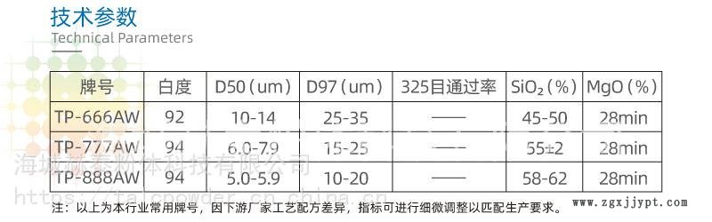 TP-888AW是一款純度高、白度高、細度高的“三高滑石粉”,作為改性填充劑添加到塑料中能獲得很好的性能,適用于對白度有要求的塑料制品。
