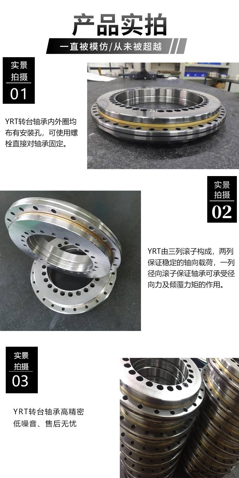 YRT轉(zhuǎn)臺軸承由一個推力/向心軸圈,一個推力墊圈,兩個滾針保持架組件和一組向心圓柱滾子組成。 座圈和軸圈有均布的安裝用螺釘孔。該型軸承具有高軸向和徑向承載能力。高傾斜剛度和極高的精度。適用于回轉(zhuǎn)工作臺,卡盤和銑刀頭以及測量和實驗中的軸承配置。該型軸承對與之相配的設(shè)備零件的要求也較高。安裝時需控制安裝螺釘?shù)呐ぞo力矩。