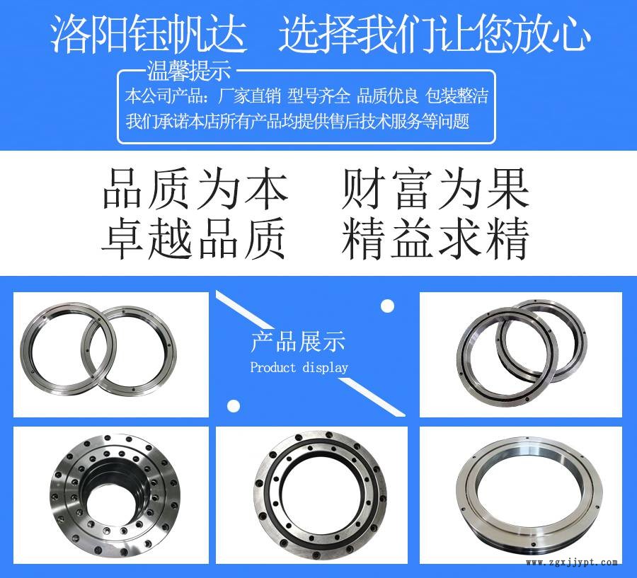 洛陽鈺帆達(dá)精密軸承廠家直銷各種系列的交叉滾子軸承,精密交叉滾子軸承,交叉滾柱軸承,十字交叉滾子軸承,交叉圓柱滾子軸承,薄壁交叉滾子軸承,高剛性,超輕超薄型交叉圓柱滾子軸承等,每種軸承型號(hào)都有對(duì)應(yīng)的參數(shù)表及圖紙供您參考。在交叉滾子軸承中,因圓柱滾子在呈90度的V型溝槽滾動(dòng)面上通過間隔保持器被相互垂直排列。這種設(shè)計(jì)使交叉滾子軸承就可以承受徑向負(fù)荷、軸向負(fù)荷及力矩負(fù)荷等所有方向的負(fù)荷。同時(shí)內(nèi)外套圈的尺寸被小限度的小型化,特別極薄形式是接近于極限的小型尺寸,而且有高剛性,所以非常適合于工業(yè)用機(jī)器人的關(guān)節(jié)部位或者旋轉(zhuǎn)部位、機(jī)械加工中心的旋轉(zhuǎn)工作臺(tái)、機(jī)械手旋轉(zhuǎn)部位、精密旋轉(zhuǎn)工作臺(tái)、醫(yī)療儀器、計(jì)量器具、IC制造裝置等廣泛用途。
