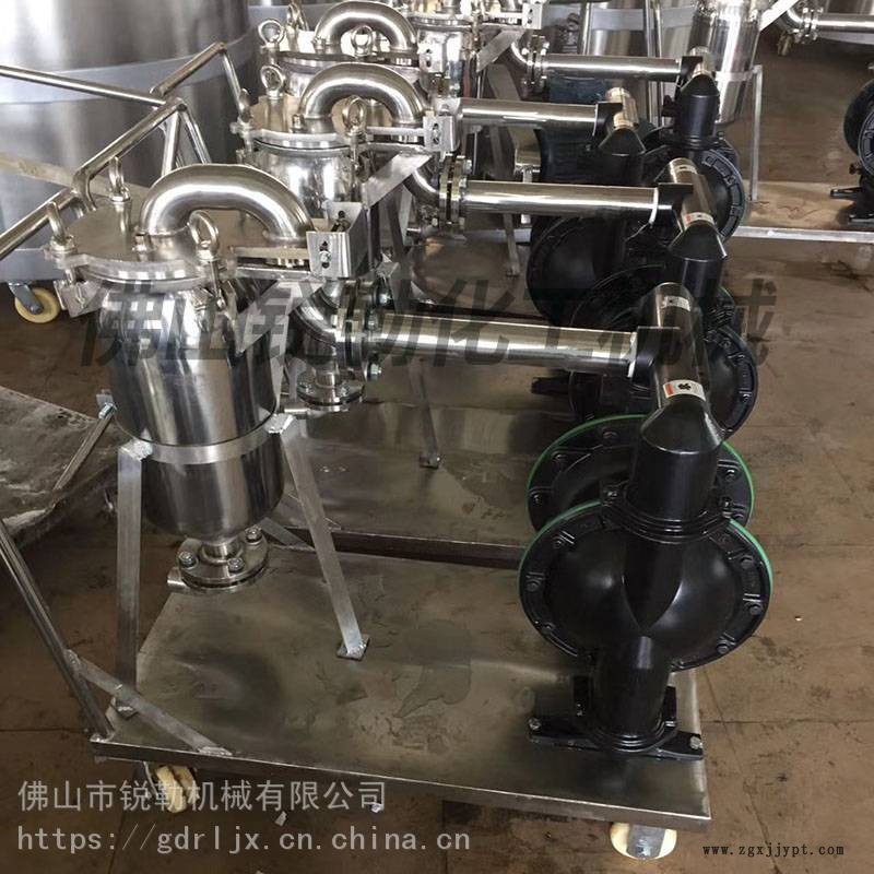 過(guò)濾小車(chē)包括了一個(gè)不銹鋼袋式過(guò)濾器、氣動(dòng)隔膜泵、氣源二聯(lián)件、單氣控閥,裝置在不銹鋼手推車(chē)上。氣動(dòng)隔膜泵將物料從拉缸或者罐體吸入至過(guò)濾器外殼的旁側(cè)入口管流入濾袋,過(guò)濾掉雜質(zhì)后的物料泵送至灌裝機(jī)進(jìn)行灌裝或者進(jìn)入儲(chǔ)罐儲(chǔ)存。袋式過(guò)濾器是一種壓力式過(guò)濾裝置,主要有過(guò)濾筒體、過(guò)濾筒蓋和快開(kāi)機(jī)構(gòu)、不銹鋼濾袋加強(qiáng)網(wǎng)等主要部件組成,濾液由過(guò)濾機(jī)外殼的旁側(cè)入口管流入濾袋,濾袋本身是裝置在加強(qiáng)網(wǎng)籃內(nèi),液體滲透過(guò)所需要細(xì)度等級(jí)的濾袋即能獲得合格的濾液,雜質(zhì)顆粒被濾袋攔截。不銹鋼移動(dòng)小車(chē),帶萬(wàn)向腳輪,移動(dòng)方便。無(wú)電火花產(chǎn)生,符合防爆要求。