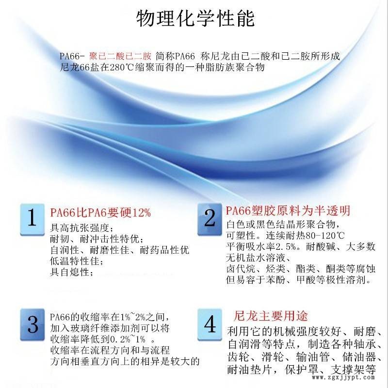PA66是聚酰胺類塑料的通稱,它們在結(jié)構(gòu)上都具有酰胺基,性能上有相似之處。PA66是一類韌性,角質(zhì),從微黃透明到不透明的材料。一般的尼龍是結(jié)晶性塑料,也有無定形的透明尼龍。PA66在較高溫度也能保持較強(qiáng)的強(qiáng)度和剛度。PA66在成型后仍然具有吸濕性,其程度主要取決于材料的組成、壁厚以及環(huán)境條件。PA66的收縮率在1%~2%之間,加入玻璃纖維添加劑可以將收縮率降低到0.2%~1%。收縮率在流程方向和與流程方向相垂直方向上的相異是較大的。PA66對許多溶劑具有抗溶性,但對酸和其它一些氯化劑的抵抗力較弱。用途生產(chǎn)軸承,齒輪,車輪,軸輥,水泵葉輪,風(fēng)扇葉片,輸油管,儲油管,繩索,魚網(wǎng),變壓器線圈等。