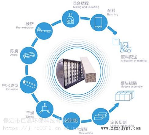 波紋板式催化劑的制造工藝一般以用玻璃纖維加強的TiO2為基材,將WO3、V2O5等活性成份浸漬到催化劑的表面,以達到提高催化劑活性、降低SO2氧化率的目的。