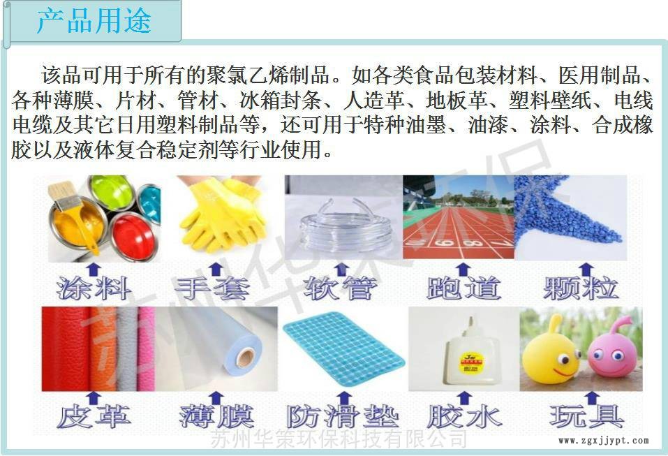 華策環(huán)保增塑劑 應(yīng)用領(lǐng)域 該品可用于所有的聚氯乙烯制品。如:各類食品包裝材料、醫(yī)用制品、各種薄膜、片材、管材、冰箱封條、人造革、地板革、塑料壁紙、電線電纜及其它日用塑料制品等,還可用于特種油墨、油漆、涂料、合成橡膠以及液體復(fù)合穩(wěn)定劑等行業(yè)使用。