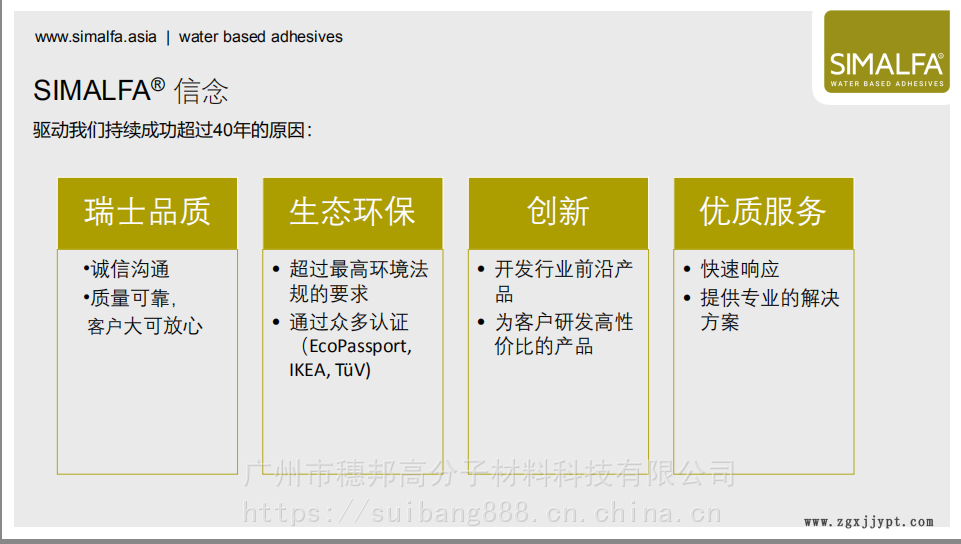 | 有效期 : | N/A | 功能 : | SIMALFA 309是一款不含溶劑、壓力敏感型、水性分散膠粘劑 ,適用于海綿,軟體材料等。該膠粘劑 |