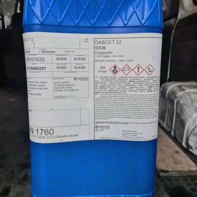 Dabco T-12(二月桂酸二丁錫)是一種沸點高的有機錫化合物。它在聚氨酯泡沫、涂層、粘附劑及密封劑的制造中用作催化劑。雖然純二月桂酸二丁錫在室溫下為固態(tài),但本公司Dabco T-12經(jīng)過特別處理,在18℃以上均呈液體狀態(tài)。由于氣候變化T-12物理性狀可能發(fā)生變化,如有變化,客戶應(yīng)把T-12加溫至65℃均可。