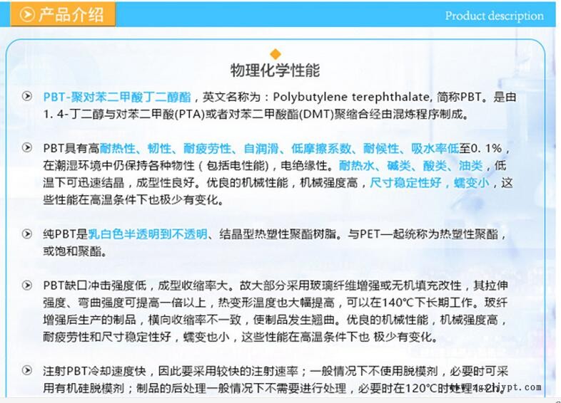 概述材料為聚對(duì)苯二甲酸丁二醇酯(PBT),擠出級(jí) 類別: 聚合物,熱塑性聚酯,TP 聚對(duì)苯二甲酸丁二酯(PBT) ,聚對(duì)苯二甲酸丁二酯(PBT),擠出級(jí) 材質(zhì)說(shuō)明: 此屬性數(shù)據(jù)MatWeb的數(shù)據(jù)庫(kù)類別“聚對(duì)苯二甲酸丁二酯(PBT),擠出級(jí)”總結(jié)了類似的材料。報(bào)告的每個(gè)屬性的值范圍是適當(dāng)MatWeb的條目的**小值和**大值。的注釋報(bào)告的平均值,用于計(jì)算平均值的數(shù)據(jù)點(diǎn)的數(shù)目。值不一定是典型的任何特定的品位,尤其是不太常見(jiàn)的價(jià)值觀和那些可以受影響 添加劑或加工方法。 杜邦高性能聚合物可以是你的合作伙伴,以幫助您進(jìn)行一個(gè)項(xiàng)目從概念到商業(yè)化。我們的產(chǎn)品往往是昂貴的高性能特種聚合物和金屬之間架起了一座橋梁。 泰科納是一個(gè)以解決方案為導(dǎo)向的公司,采用先進(jìn)的聚合物技術(shù)生產(chǎn)高性能塑料材料