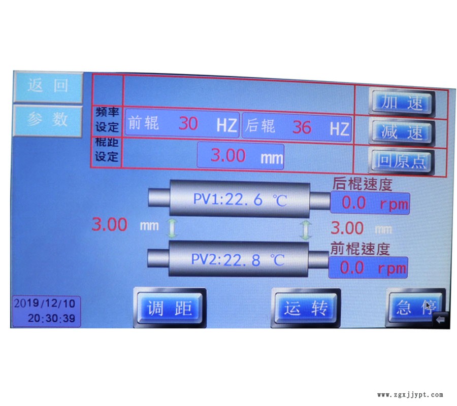 控 制 器 | PLC可編程式彩色觸摸屏顯示器,可設(shè)置和顯示輥筒的溫度、間距和轉(zhuǎn)數(shù)等工藝參數(shù) |