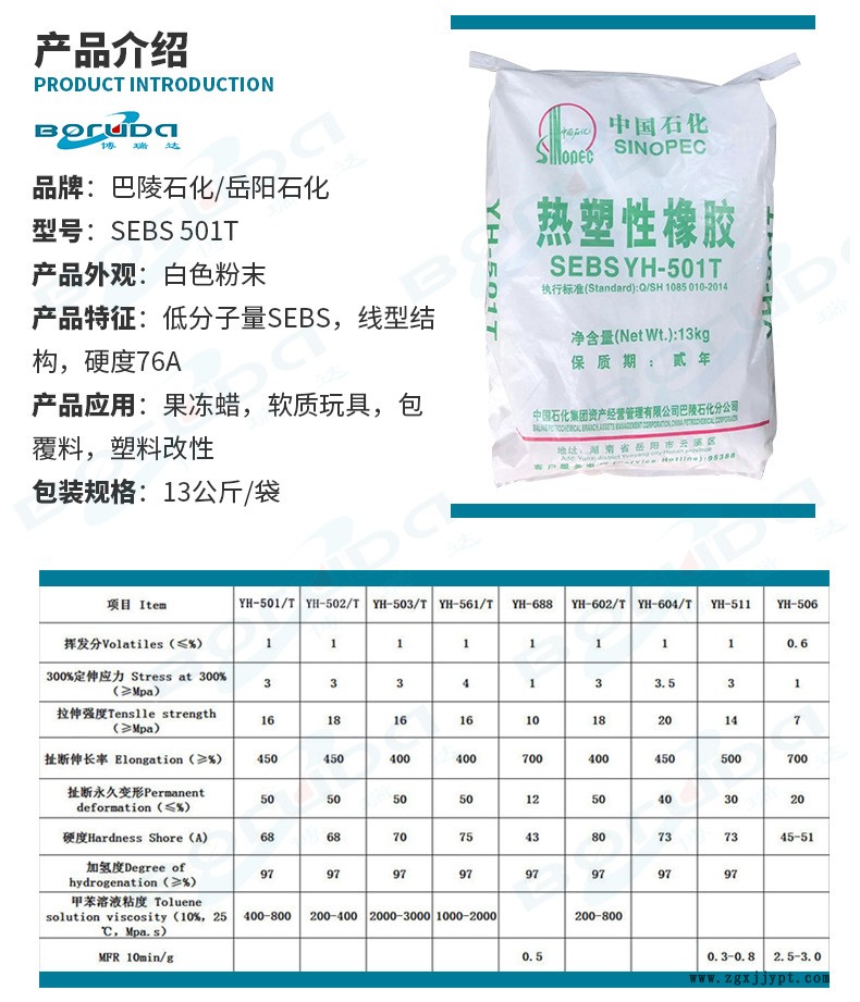 巴陵石化SEBS是由特定結(jié)構(gòu)的SBS經(jīng)選擇加氫而得到的聚合物,外觀為白色粉末或顆粒,具有良好的機(jī)械力學(xué)性能,耐老化性能,優(yōu)異的表面質(zhì)感,無毒,對環(huán)境友好等特點。廣泛用于包裝材料,醫(yī)療器械,軟接觸材料(如手柄,文具,玩具),運動器材,密封條,日用品,汽車和消費類電子等領(lǐng)域。