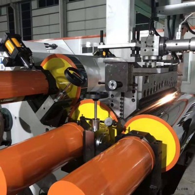 PET片材生產(chǎn)工藝:---原料預(yù)結(jié)晶處理;---用擠出機將物料加熱、輸送、壓縮;---物料通過分散混合、溶體均化,再以穩(wěn)定壓力輸入過濾器和平擠模頭;---溶體過濾;---溶體均質(zhì)穩(wěn)定泵出;---共擠分配均質(zhì)分層;---溶體在模頭內(nèi)均勻分流、定量穩(wěn)定擠出;---模片成型;---三輥壓片、冷卻、定型;---切廢邊至要求幅寬尺寸;---自然冷卻輸送片材;---手卷廢邊;---穩(wěn)定牽引片材;恒張力反饋手卷片材