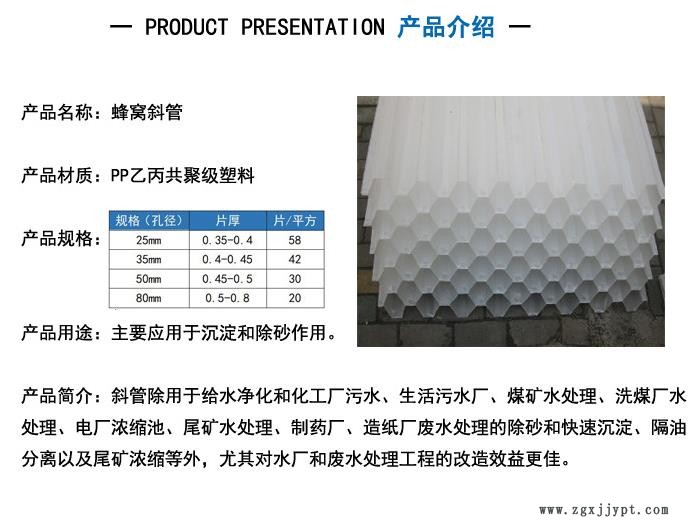 蜂窩斜管主要用于各種沉淀和除砂作用。是近十年來(lái)在給排水工程中采用廣泛而且成為一項(xiàng)水處理裝置。它適用范圍多,處理效果高,占地面積小等優(yōu)點(diǎn)。適用于進(jìn)水口除砂,一般工業(yè)和生活給水沉淀、污水沉淀、隔油以及尾張濃縮等處理,即適用于新建工程,又適用于現(xiàn)有舊池的改造,均能取得良好的經(jīng)濟(jì)效益。