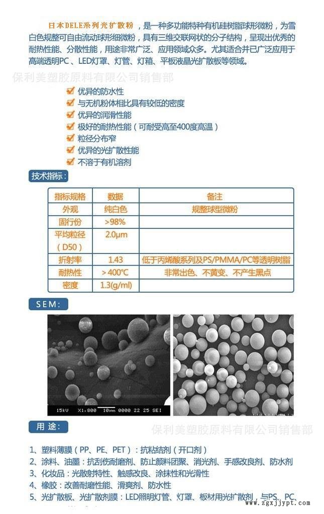 1.本品和日本鐘淵的產(chǎn)品對比鐘淵的粉直徑太大顯微鏡下觀看形狀不規(guī)則,這對導(dǎo)光率有很大影響,目前很少有企業(yè)使用。2.本品和硅系列光擴(kuò)散粉的對比硅系列耐溫很好,但是粉體太細(xì),白度不夠,如果做稍厚的產(chǎn)品會(huì)感覺發(fā)灰色,白度不夠,透光率差。而且密度大,性價(jià)比不高,容易沉淀。3.本品是如何生產(chǎn)的?本品是采用超低溫研磨生產(chǎn)的。先把樹脂放在超低溫-200度下,樹脂會(huì)變的很脆,然后經(jīng)過多級研磨而成,外觀是規(guī)則的圓球狀。產(chǎn)品密度適中可以懸浮在封裝樹脂中。白度高,因?yàn)槭且?guī)則的圓形所以導(dǎo)光率高。目前擁有此套設(shè)備的有日本信越和DELE4.如何買到你合適的光擴(kuò)散粉?像三菱的光擴(kuò)散PC等級為何售價(jià)30元以上,我們來分析下成本,光擴(kuò)散PC=PC+光擴(kuò)散劑《1%)其中光擴(kuò)散劑的含量小于0.5%普通的PC售價(jià)20元/KG 為何添加了0.5%都不到的光擴(kuò)散粉后售價(jià)能增加10元呢,我們有理由相信每公斤PC所含的光擴(kuò)散粉的成本在5元.所以我推斷三菱的光擴(kuò)散劑成本是250-300元/KG 很清楚了你認(rèn)為200元以下能買到可以使用的光擴(kuò)散粉嗎? 還在找靠譜的光擴(kuò)散粉嗎? 本公司自2012年引進(jìn)此款光擴(kuò)散粉,目前已有多家企業(yè)使用,企業(yè)的反應(yīng)是和信越的產(chǎn)品性能完全相同 本產(chǎn)品適合LED灌裝使用