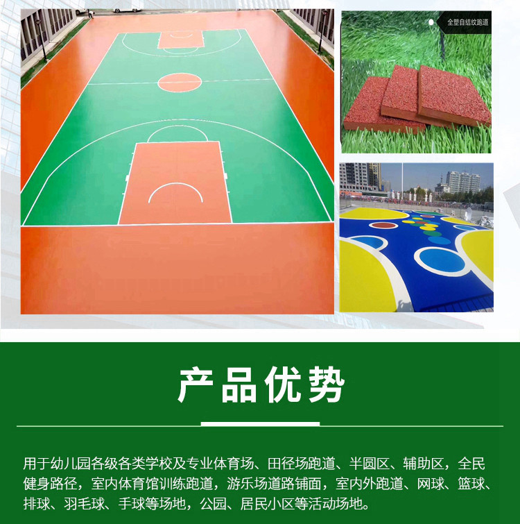 塑膠跑道又稱全天候田徑運動跑道,它由聚氨酯預(yù)聚體、混合聚醚、廢輪胎橡膠、EPDM橡膠?;騊U顆粒、顏料、助劑、填料組成。塑膠跑道具有平整度好、抗壓強度高、硬度彈性適當、物理性能穩(wěn)定的特性,有利于運動員速度和技術(shù)的發(fā)揮,有效地提高運動成績,降低摔傷率。塑膠跑道是由聚氨酯橡膠等材料組成的,具有一定的彈性和色彩,具有一定的抗紫外線能力和耐老化力是國際上公認的全天候室外運動場地坪材料。