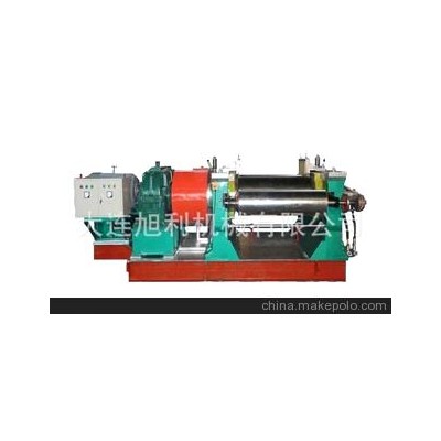 本機為雙輥精煉機,主要由底座、機架、壓蓋、電動機、減速機、輥筒、速比齒輪副、調(diào)距裝置、緊急停車裝置、刮膠裝置、修邊、卷曲裝置等部組成。輥筒呈腰鼓形,在輥距較小的情況下操作。能排除再生膠中部分硬顆粒,同時對膠料有較大的剪切作用,促進橡膠分子鏈的斷裂,通過精煉的再生膠膠片外觀光滑,可塑度顯著提高,伸長率也隨之上升。