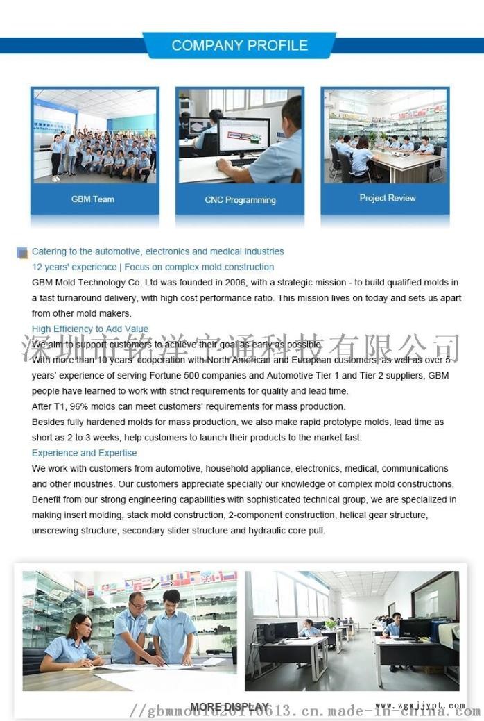 生產(chǎn)注塑模具,塑膠模具加工制造廠介紹 深圳市銘洋宇通科技有限公司 (GBM Mold)是一家擁有高新技術企業(yè)資質的精密模具廠,通過SGS認證,有進出口經(jīng)營權,專注做高品質的中小型復雜結構注塑模具,如雙色模,包膠模,疊層模,金屬嵌件模,自動脫螺紋模具等等,提供樣板3D抄數(shù),產(chǎn)品設計分析,開模與注塑一條龍服務。