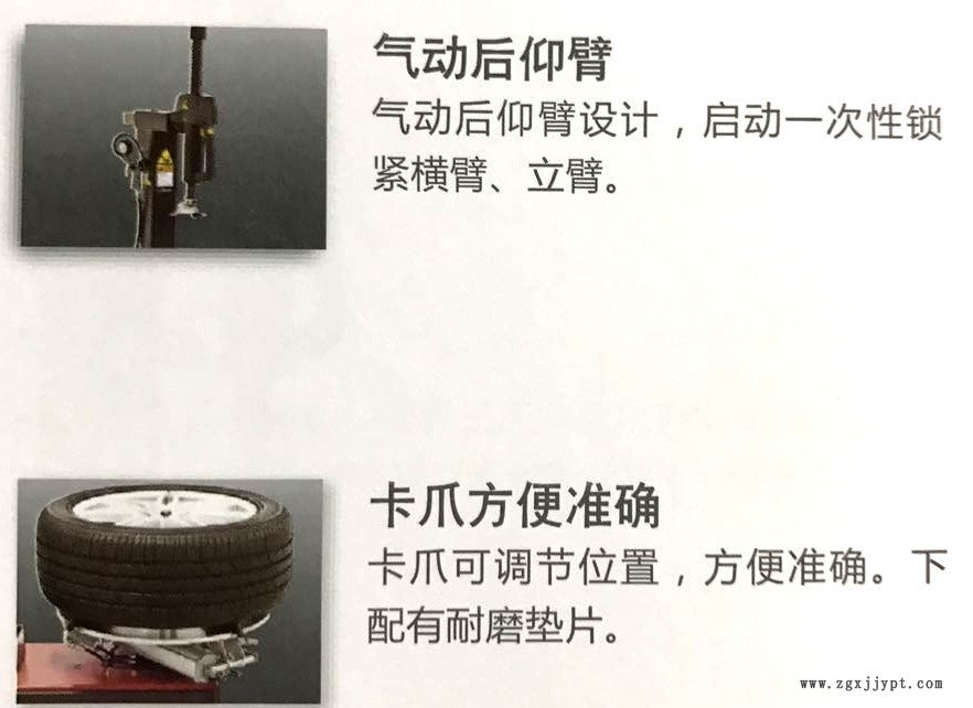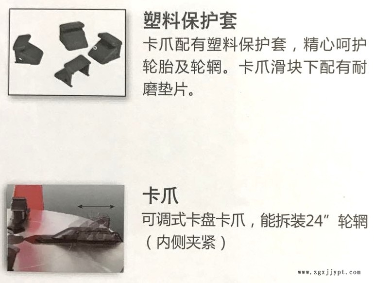 n 卡盤夾具和拆裝頭上的塑料保護件合理地保護鋁合金輪轂。拆裝頭根據(jù)不同輪轂的尺寸可上下、前后調(diào)整位置。