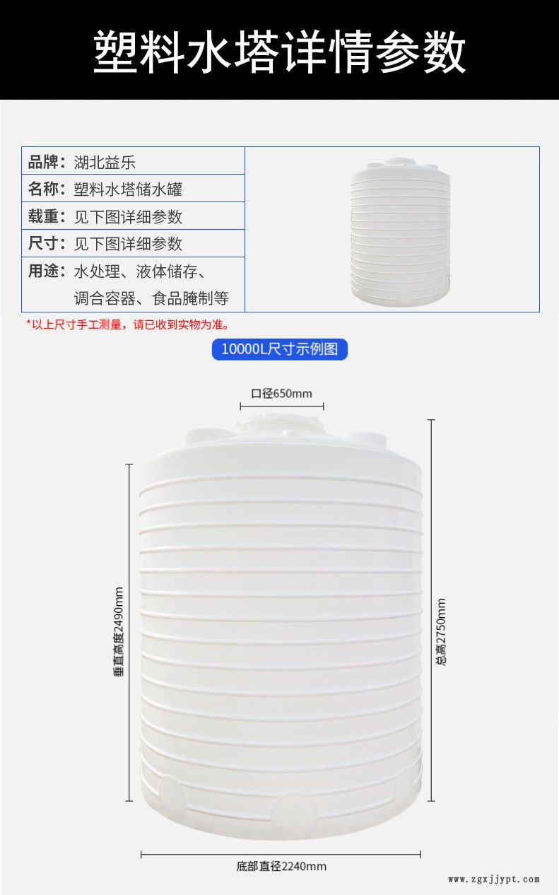 益樂塑料水塔?「10T塑料水塔」?塑料大圓桶 武漢塑料水塔廠家由于本廠大部分屬于泡貨,本店大件的商品發(fā)往全國(guó)各地的運(yùn)費(fèi)差異較大,很難統(tǒng)一快遞運(yùn)費(fèi),店內(nèi)所標(biāo)運(yùn)費(fèi)均為參考價(jià)格,不是真正運(yùn)費(fèi),具體運(yùn)費(fèi)可咨詢客服人員,如有不便,敬請(qǐng)諒解。我公司鄭重承諾:為打消買家擔(dān)心異地購買貨物運(yùn)費(fèi)高的顧慮,我們不會(huì)在運(yùn)費(fèi)方面賺買家一分錢我公司所收取的運(yùn)費(fèi)均為我們發(fā)貨時(shí),各貨運(yùn)單位實(shí)際向我們收取的運(yùn)費(fèi)。