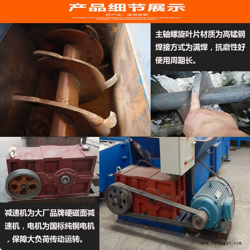 泡沫壓塊機(jī)又稱為聚乙烯減容機(jī),其原理是用螺旋壓縮機(jī)構(gòu)把泡沫壓縮成塊。使用時,操作者只要把泡沫塊投進(jìn)料斗,機(jī)器里面有撕碎機(jī)構(gòu)把泡沫塊打碎,然后螺旋機(jī)構(gòu)就把小塊的泡沫擠壓成截面為方形的壓縮塊。壓縮段前端有一個壓力調(diào)節(jié)裝置,用來調(diào)節(jié)壓縮比例。根據(jù)原料的特點(diǎn),壓縮比例可達(dá)30~40倍,以達(dá)到減小泡沫體積的目的,以方便遠(yuǎn)距離運(yùn)輸與回收造粒。