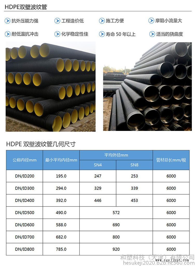 HDPE雙壁波紋管材是以高密度聚乙烯為原料的一種新型輕質(zhì)管材,具有重量輕、耐高壓、韌性好、施工快、壽命長(zhǎng)等特點(diǎn),其優(yōu)異的管壁結(jié)構(gòu)設(shè)計(jì),與真他結(jié)構(gòu)的管材相比,成本大大降低。并且由于連接方便、可靠,在國(guó)內(nèi)外得到廣泛應(yīng)用。大量替代混凝土管和鑄鐵管。主要優(yōu)點(diǎn):1、抗外壓能力強(qiáng)外壁呈環(huán)形波紋狀結(jié)構(gòu),大大增強(qiáng)了管材的環(huán)剛度,從而增強(qiáng)了管道對(duì)土壤負(fù)荷的抵抗力,在這個(gè)性能方面,HDPE雙壁波紋管與其他管材相比較具有明顯的優(yōu)勢(shì)。2、工程造價(jià)低在等負(fù)荷的條件下,HDP E雙壁波紋管只需要較薄的管璧**可以滿足要求。因此,與同材質(zhì)規(guī)定的實(shí)壁管相比,能節(jié)約一半左右的原材料,所以HDPE雙壁波紋營(yíng)造價(jià)也較低。這是該管材的又一個(gè)很突出的特點(diǎn)。3、施工方便由于HDPE雙壁波紋管重量輕,搬運(yùn)和連接都很方便,所以施工快捷、維護(hù)工作簡(jiǎn)單。在工期緊和施工條件差的情況下、其優(yōu)勢(shì)更加明顯。4、摩阻系數(shù)小,流量大采用HDPE為材料的HDPE雙壁波紋管比相口徑的其他管材可通過更大的流量。換言之,相同的流量要求下,可采用口徑相對(duì)較小的HDPE雙壁波紋管。5、良好的耐低溫,抗沖擊性能HDPE雙壁波紋管的脆化溫度是-70℃。一般低溫條件下(-30℃以上)施工時(shí)不必采取特殊保護(hù)措施,冬季施工方便,而且,HDPE雙壁波紋管有良好的抗沖擊性。6、化學(xué)穩(wěn)定性佳由于HDPE分子沒有極性,所以化學(xué)穩(wěn)定性極好。除少數(shù)的強(qiáng)氧化劑外,大多數(shù)化學(xué)介質(zhì)對(duì)其不起破壞作用。一般使用環(huán)境的土壤、電力、酸堿因素都不會(huì)使該管道破壞,不滋生細(xì)菌,不結(jié)垢,其流通面積不會(huì)隨運(yùn)行時(shí)間增加而減少。7、物理性能環(huán)剛度( KN/m????):SN4≥4 SN8≥8沖擊性能(TIR),%:≤10環(huán)柔性:試樣圓滑, 無反向彎曲, 無破裂, 兩壁無脫開烘箱試驗(yàn):無氣泡, 無分層, 無開裂連接密封試驗(yàn):不泄露蠕變比率:≤48、使用壽命長(zhǎng)在不受陽(yáng)光紫外線條件下,HOPE的雙壁波紋管的使用年限可達(dá)50年以上。9、優(yōu)異的耐磨性能德國(guó)曾用試驗(yàn)證明,HOPE的耐磨性甚至比鋼管還要高幾倍。10、適當(dāng)?shù)膿锨纫欢ǖ拈L(zhǎng)度的HDPE雙壁波紋管軸向可略為撓曲,不受地面一定程度的不均勻沉降的影響,可以不用管件**直接鋪在略為不直的溝槽內(nèi)等等。應(yīng)用范圍1、 市附排水、 排污管道系統(tǒng)工程;2、 公寓、 住宅小區(qū)地下埋設(shè)排水排污;3、 高速公路預(yù)埋管道,高爾夫球場(chǎng)地下滲水管網(wǎng);4、 農(nóng)田水利灌溉輸水、 排澇等水利工程;5、 化工、 礦山用于流體的輸送及通風(fēng)等;75、 地下管線的保護(hù)套管和通信電纜護(hù)套管等。