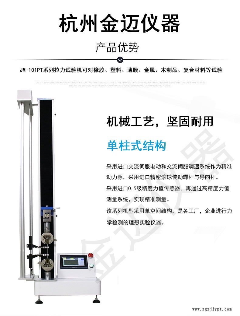 JM-101PT系列 單柱觸屏拉力試驗(yàn)機(jī)采用單柱結(jié)構(gòu),力范圍,對載荷、變形、位移的測量和控制有較高的精度和靈敏度,具有應(yīng)力、應(yīng)變、位移方式,可求出大力值、抗拉強(qiáng)度、彎曲強(qiáng)度、壓縮強(qiáng)度、彈性模量、斷裂延伸率、屈服強(qiáng)度等參數(shù),適用于拉伸、壓縮、剝離、撕裂、剪切等力學(xué)性能試驗(yàn)及分析。