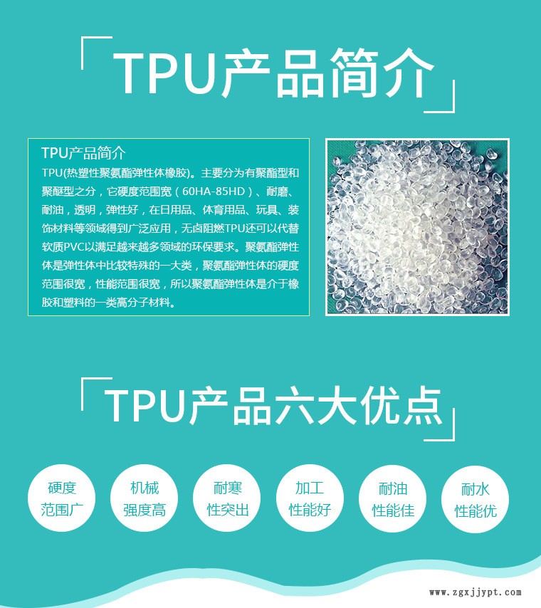 高耐磨性 在很寬的溫度范圍內(nèi)具有靈活性 在整個硬度范圍內(nèi)具有高彈性 優(yōu)異的耐油,油脂和多種溶劑性 良好的耐候性 本質(zhì)上柔軟,不需要增塑劑 優(yōu)異的抗高能輻射性 優(yōu)異的耐腐蝕性(特殊等級) 柔軟的觸感 良好的壓花性能 細孔結(jié)構(gòu) 凝固率高 熱塑性 良好的冷彈性 粘接強度好因此,TPU成功應用于經(jīng)濟的眾多領域,例如體育和娛樂業(yè)以及汽車行業(yè)。加入眾所周知的應用,如先進制造商的透明滑雪靴,車內(nèi)的齒輪旋鈕和中央控制臺以及Allflex的牲畜耳標,都是一些新應用,如可折疊皮劃艇,沖浪板腿繩和透氣紡織品。