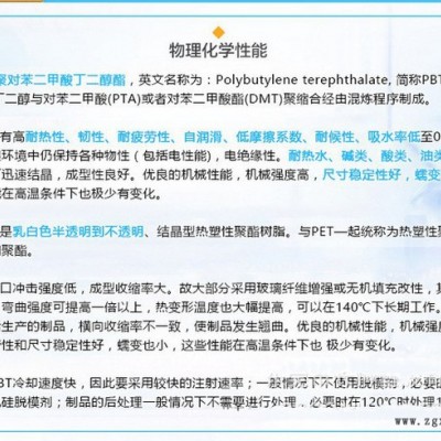 1.機(jī)械性能好,機(jī)械強(qiáng)度高,耐疲勞性和尺寸穩(wěn)定性好,蠕變也?。?br>2.生產(chǎn)PBT所消耗的能量是工程塑料中;