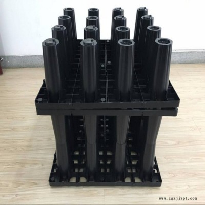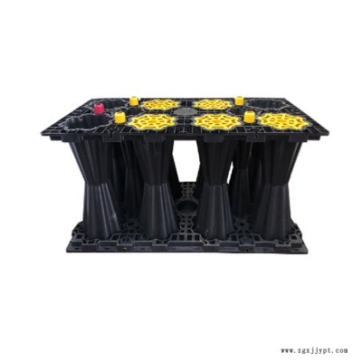 (3)底板清理完畢,確保無垃圾等之后,鋪好土工布、防水膜,把模塊進(jìn)行堆放。模塊堆放的過程中要確??诩J褂煤?。同層模塊之間卡在一起層模塊落在下層凸起的卡口上。