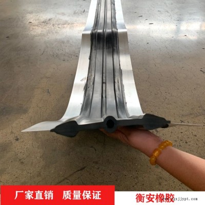 鋼邊橡膠止水帶系以一般可伸縮的橡膠和兩邊配有鍍鋅鋼邊所組成的復(fù)合件。鋼邊橡膠止水帶的斷面采用非等厚結(jié)構(gòu),分強(qiáng)力區(qū)和防水區(qū),使各部分受力