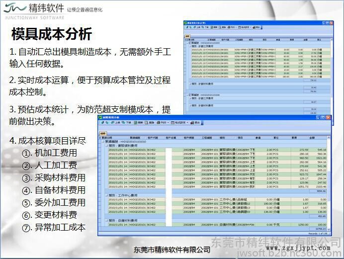東莞市精緯軟件有限公司是一家致力于改善模具企業(yè)生產(chǎn)管理的資訊服務(wù)商。我們具備模具產(chǎn)業(yè)知識(shí)、企業(yè)流程改善經(jīng)驗(yàn)、資訊技術(shù)(IT)整合及系統(tǒng)快速發(fā)展的專業(yè)能力,也了解模具廠的需求,并且累積了10多年的導(dǎo)入經(jīng)驗(yàn)。我們提供客制化服務(wù)、完整的教育訓(xùn)練課程,并即時(shí)解決您的問(wèn)題,幫助您打造一個(gè)高效率、高顧客滿意度的模具企業(yè),提升您企業(yè)的綜合競(jìng)爭(zhēng)力,最終實(shí)現(xiàn)企業(yè)經(jīng)濟(jì)效益和企業(yè)競(jìng)爭(zhēng)力的提高。