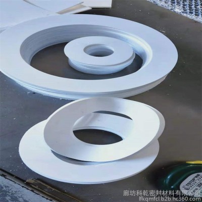 二、聚四氟乙烯夾包墊片 是由石棉橡膠板或無石棉板等軟墊片和聚四氟乙烯包覆薄片組合而成,V型(剖切型)四氟夾包墊片由四氟板機(jī)械車削而成,U型(折包型)四氟夾包墊片由四氟帶包邊后加熱粘接而成。兼具優(yōu)異的耐腐蝕性和良好的壓縮回彈率,廣泛應(yīng)用于各種強(qiáng)酸、強(qiáng)堿、強(qiáng)氧化、不允污染介質(zhì)的密封。通常適用于中、低壓部位。 三、膨脹四氟密封墊片 由聚四氟乙烯樹脂,用模具壓制后燒結(jié)而成,具有優(yōu)良耐腐蝕性能,良好的自潤滑性和不粘連性,故幾乎耐所有化學(xué)介質(zhì),且具有耐磨、耐壓、摩擦系數(shù)低等特性。 廣泛應(yīng)用于石油、化工、冶金 、機(jī)械、食品、電力等腐蝕介質(zhì)的管道、泵、閥各類設(shè)備的法蘭密封。 使用溫度:-200℃——260℃ 使用壓力:0——20.0Mpa?其實(shí)對于膨體四氟墊片來說它主要是用百分之一百的純PTFE制成的各向纖維結(jié)構(gòu)同性的板狀密封墊片。?在維持PTFE耐熱性和耐藥品性以及抗粘性等等優(yōu)異特性的同時(shí),還具有非常好的抗蠕變、冷流以及應(yīng)力松弛性,而且還可以延長熱循環(huán)的壽命長,從而實(shí)現(xiàn)增長墊片的使用壽命。一個(gè)好的壓縮回彈性能是能夠用在對應(yīng)力敏感的連接處,它完全不會受到微生物和真菌的干擾,比較特別的生產(chǎn)工藝使縱向和橫向的抗拉強(qiáng)度基本都是相同的,這使得材料在壓縮過后寬度是沒有變化的,這點(diǎn)**和膨體四氟帶完全不同之處。