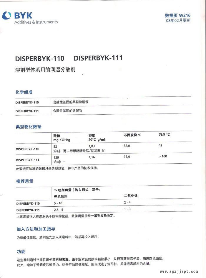 改善顏料潤濕,減少研磨過程所需時(shí)間并使顏料分散體穩(wěn)定化的溶劑型涂料用潤濕和分散助劑。顏料的解絮凝使色相和著色力穩(wěn)定化并防止了浮色/發(fā)花。本助劑強(qiáng)烈減少了粘度并改善了涂料的光澤和流平。DISPERBYK®-110適宜于使無機(jī)顏料尤其是二氧化鈦穩(wěn)定化,并強(qiáng)烈減少研磨料的粘度。它減少了含有無機(jī)顏料的涂料在用靜電噴涂施工時(shí)發(fā)生的霧影。