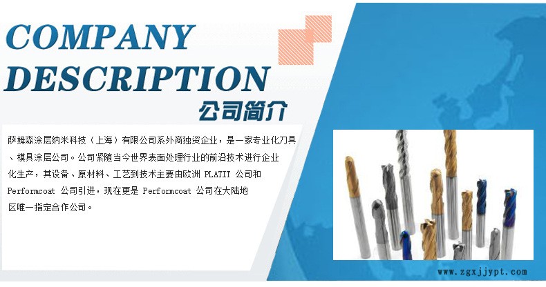 薩姆森涂層納米科技(上海)有限公司系外商獨資企業(yè),是一家專業(yè)化刀具、模具涂層公司。公司緊隨當(dāng)今世界表面處理行業(yè)的前沿技術(shù)進行企業(yè)化生產(chǎn),其設(shè)備、原材料、工藝到技術(shù)主要由歐洲PLATIT 公司和Performcoat 公司引進,現(xiàn)在更是Performcoat 公司在大陸地區(qū)**指定合作機構(gòu)。