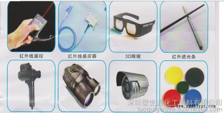 紅外線穿透聚甲基丙烯酸甲脂(PMMA)特性:有效透射800-1100納米紅外工作波段,主要透過率達(dá)95%。是目前紅外線透過率**大的工程塑料。紅外線穿透PC或PMMA被廣泛用于紅外線遙控接收、紅外線感應(yīng)器、3D眼鏡、夜視儀器、遙控器、紅外線攝像頭安防,醫(yī)療設(shè)備等。PC強(qiáng)度比PMMA稍好,透過率略低,表面硬度不及PMMA,但PMMA性脆!透紅外PMMA(藍(lán)色,紅色,紫色,黃色,綠色)顆粒外觀看似黑色,但經(jīng)光線照射以后可以呈現(xiàn)藍(lán)色或紅色或紫色或綠色或黃色5種紅外效果。廣泛應(yīng)用于各類透紅外塑膠制品之中,適合注塑成型和擠出。黃光和綠光效果須提前預(yù)定。