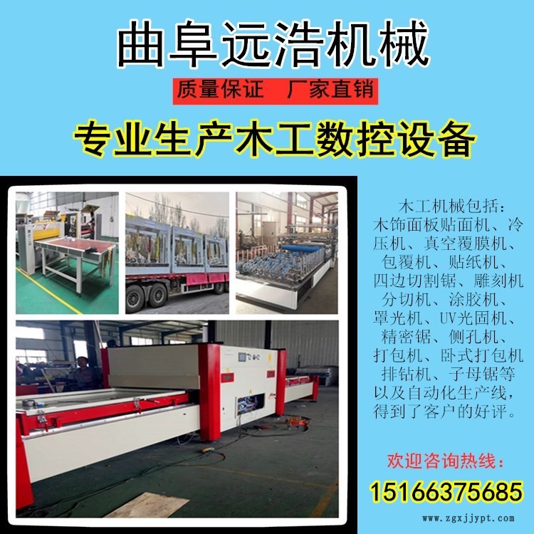 其中木工機(jī)械包括:貼面機(jī)、PUR熱熔膠貼面機(jī)、真空曲面覆膜機(jī)、大負(fù)壓真空覆膜機(jī)、冷熱膠型包覆機(jī)、PUR熱熔膠包覆機(jī)、大板貼紙機(jī)、PVC貼面機(jī)、冷壓機(jī)、雕刻機(jī)、側(cè)孔機(jī)、罩光機(jī)、uv光固機(jī)、涂膠機(jī)、分切機(jī)、精密鋸、數(shù)控四邊切割鋸、熱壓貼面機(jī)、打包機(jī)、以及訂制自動(dòng)化生產(chǎn)線等十幾大系列幾十種型號的木工機(jī)械,已在市場享有良好的口碑,得到了客戶的好評。