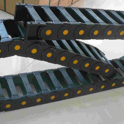 外形似坦克鏈,由眾多的單元鏈接組成,鏈接之間轉(zhuǎn)動自如。相同系列的拖鏈的內(nèi)高、外高、節(jié)距相同,拖鏈內(nèi)寬、彎曲半徑R可有不同的選擇。單元鏈節(jié)由左右鏈板和上下蓋板組成,拖鏈每節(jié)都能打開,裝拆方便,不必穿線,打開蓋板后即可把電纜、油管、氣管、水管等放入拖鏈。另可提供分隔片,將鏈內(nèi)空間按需要分隔開。塑料拖鏈材料:增強尼龍,具有較高的壓力和抗拉負荷、良好的韌性、高彈性和耐磨性、阻燃、高低溫時性能穩(wěn)定,可以在室外使用,尼龍含量的多少決定了拖鏈的使用強度和耐磨性以及運行起來的噪音大小。尼龍含量從5%-17%不等,但超不過19%。一般都是30%左右的含量。抗耐性:耐油、耐鹽,并有一定的耐酸、耐堿能力。運行速度和加速度(具體速度、加速度視運行情況而定)。運行壽命。看結(jié)構(gòu)不但能夠在力學上發(fā)回作用,而且要看外觀。