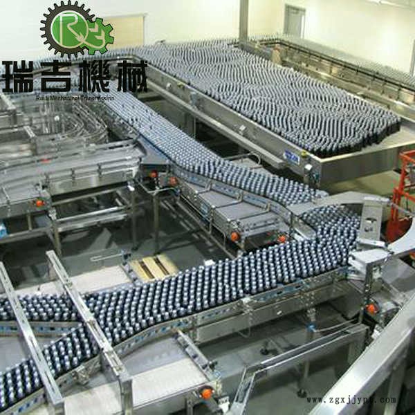 用于無壓力輸瓶段的PET塑料瓶輸瓶線,此技術解決了中、高速瓶裝生產(chǎn)線或者空瓶輸送系統(tǒng)中由多列輸瓶變單列輸瓶時擠瓶、卡瓶、倒瓶、破瓶、噪聲大、不穩(wěn)定可靠等問題,它是由一段多列,速度不等的三段鏈板輸送機組成,長約8米,用特別設計的傳動系統(tǒng)將過渡段的速度形成差速,利用速度差將瓶罐由多列逐漸轉(zhuǎn)變成單列輸送,由于具有以上特點,所以鏈板輸送機被廣泛的運用在空瓶輸送及實瓶輸送系統(tǒng)。