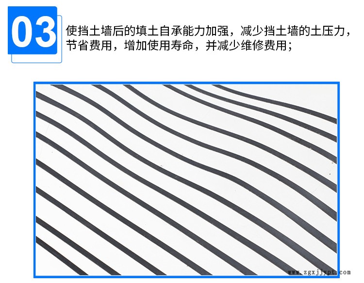單向拉伸土工格柵是一種高強度土工合成材料。廣泛應(yīng)用于堤壩、隧洞、碼頭、公路、鐵 路、建筑等領(lǐng)域。 其主要用途如下: 1. 增強路基,可有效地分配擴散載荷,提高路基的穩(wěn)定性和承載力,延長使用壽命; 2. 可承受更大的交變載荷; 3. 防止路基材料流失造成的路基變形、開裂; 4. 使擋土墻后的填土自承能力提高,減少擋土墻的土壓力,節(jié)省費用,延長使用壽命,并降低維修費用; 5. 結(jié)合噴錨混凝土施工方法進行邊坡維護,不僅可節(jié)省30%—50%的投資,而且可以縮短工期一倍以上; 6. 在公路的路基和面層中加入土工格柵,可以降低彎沉,減少車轍,推遲裂縫出現(xiàn)時間3—9倍,可減少結(jié)構(gòu)層厚度達36%; 7. 適用于各種土壤,無需異地取材,省工省時;8. 施工簡單快捷,可大大降低施工成本 |