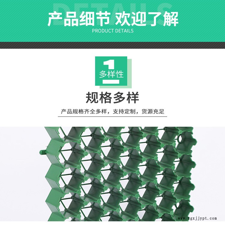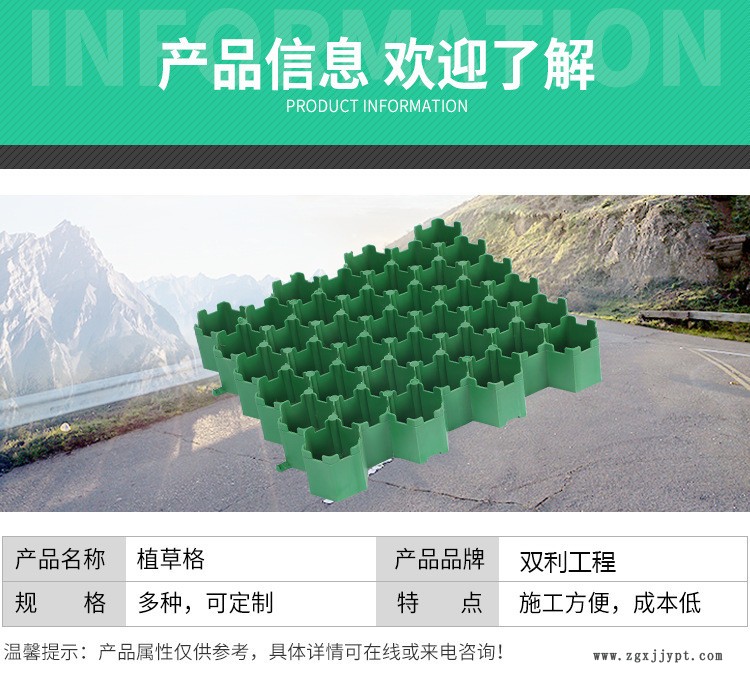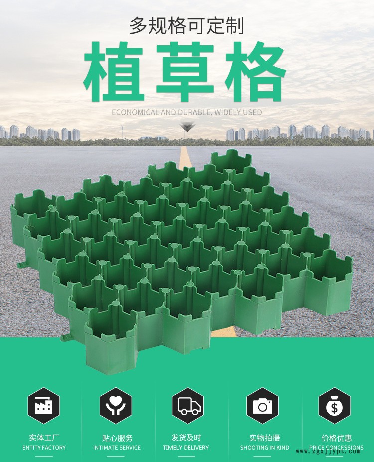 | 植草格采用改性高分子量HDPE為原料,綠色環(huán)保,完全可回收;實現(xiàn)了草坪、停車場二合一,植草格耐壓、耐磨、抗沖擊、抗老化、耐腐蝕,提升了品質(zhì),節(jié)約了投資; 獨特的平插式搭接,省工、快捷,可調(diào)節(jié)伸縮縫。 1、完全綠化:草格提供超過95%的植草面積,完全的綠化效果,可以吸音、吸塵,明顯提升了環(huán)境的品質(zhì)與品味。(參考:混凝土植草磚只有30%空隙)2、節(jié)約投資:植草格使停車與綠化功能合二為一,可節(jié)約開發(fā)商的寶貴投資。3、平整完整:植草格獨特而穩(wěn)固的平插式搭接使整個鋪設(shè)面連成一個平整的整體,避免局部凹陷,施工極其便捷。 (參考:混凝土植草磚每塊獨立,必須澆筑混凝土墊層基礎(chǔ),方保持平整)4、高強度、長壽命:植草格采用技術(shù)的特殊材料,抗壓能力200噸/平米,大于規(guī)范要求的消防登高面32噸/平米。5、性能穩(wěn)定性,抗紫外線、耐酸堿腐蝕、抗磨壓,耐候-40℃-90℃。(參考:混凝土植草磚很容易在溫度變化及霜凍時開裂 破損)6、排水優(yōu)良:碎石承重層提供了良好的到水功能,方便多余降水的排出。 |