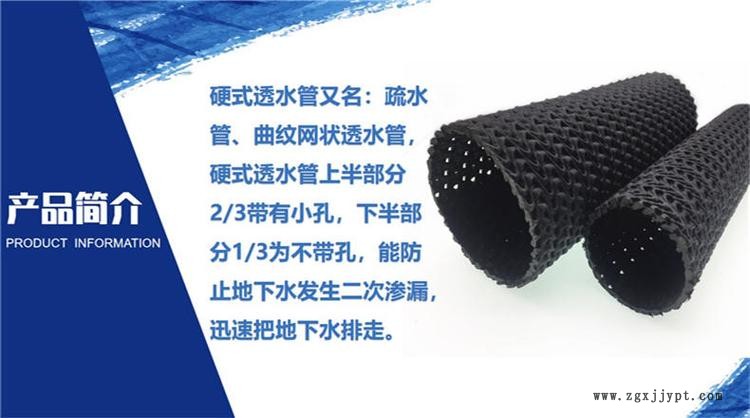 硬式透水管(又名疏水管、曲紋網(wǎng)狀透水管),硬式透水管上半部分2/3帶有小孔,下半部分1/3為不帶孔,能防止地下水發(fā)生二次滲漏,迅速把地下水排走。