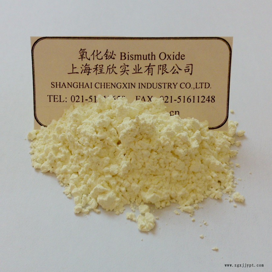 三氧化二鉍純品有α型和β型。α型為黃色單斜晶系結(jié)晶,相對(duì)密度8.9,熔點(diǎn)825 ℃,溶于酸,不溶于水和堿。β型為亮黃色至橙色,正方晶系,相對(duì)密度8.55,熔點(diǎn)860 ℃,溶于酸,不溶于水。容易被氫氣、烴類等還原為金屬鉍