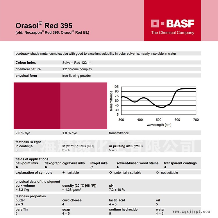 產(chǎn)品特性:德國巴斯夫BASF Orasol Red 395/BL金屬絡合染料是一種溶劑可溶的高透明藍相紅色耐高溫鉻金屬絡合物染料。在極性有機溶劑中具有優(yōu)異的溶解性和良好的牢度性能,幾乎不溶于水。推薦應用于圓珠筆油墨、柔性版/凹版油墨、溶劑型木器漆、透明涂料等。