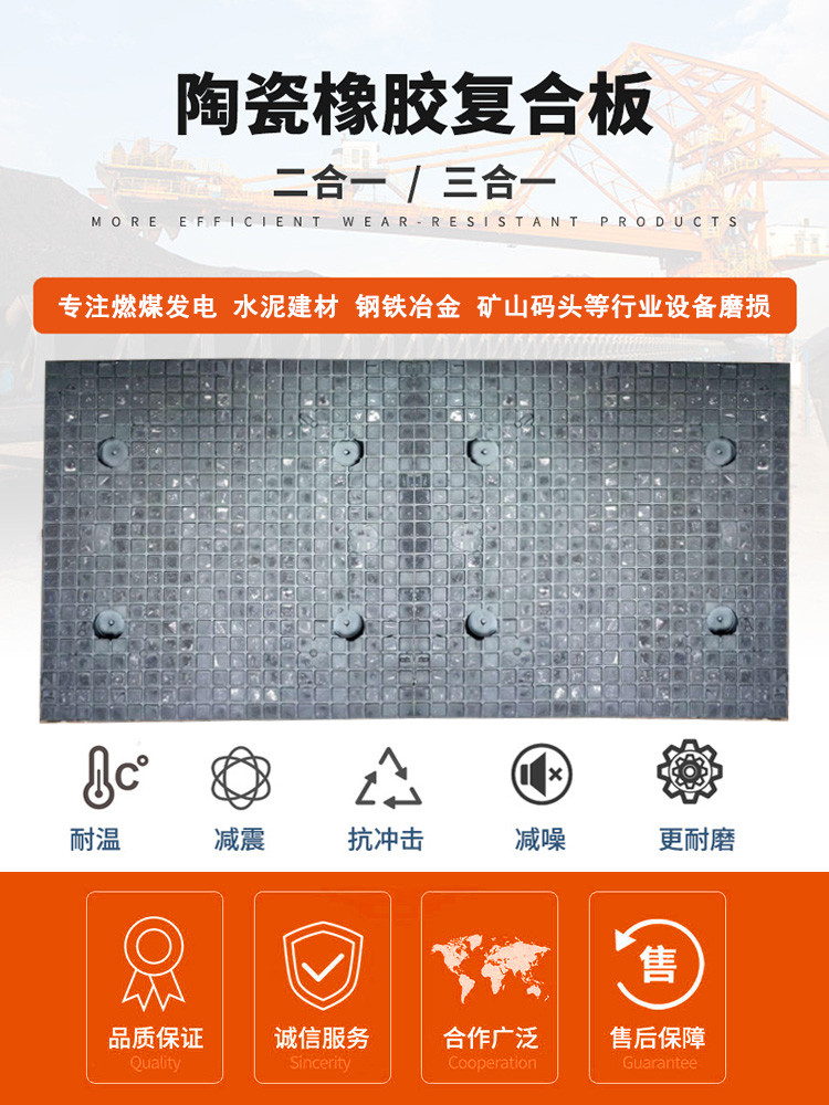 陶瓷橡膠復(fù)合襯板是采用先進(jìn)的熱硫化工藝,將增韌耐磨陶瓷和橡膠硫化在一起,再用高強(qiáng)度有機(jī)粘合劑將襯板粘接在設(shè)備的內(nèi)殼鋼板上,形成堅固且有緩沖力的防磨層。它結(jié)合了陶瓷的高硬度和橡膠的高緩沖及抗疲勞性能方面的優(yōu)點,可以很好地解決大塊物料輸送過程中的設(shè)備防磨問題。橡膠的加入,除具有良好的抗磨損和防腐蝕作用外,也能防止因物料聚集造成停產(chǎn)和降低噪聲。 也可以直接將增韌耐磨陶瓷片和特種橡膠硫化在帶沉頭螺栓的鋼板上,構(gòu)成各種形狀的耐磨襯板,方便安裝和更換。