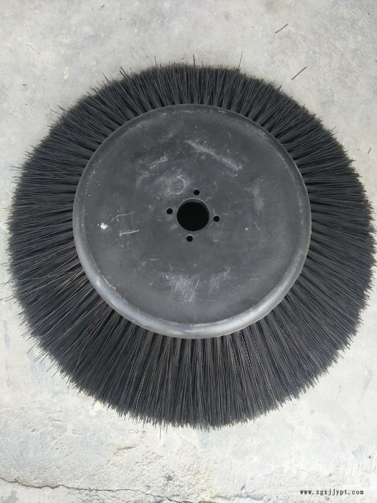 掃路刷:在切割好的PP圓盤上成一定角度(∠135°)鉆孔,再用切好的扁鋼絲或PP刷絲、尼龍絲對折后串插即可,刷子裝在市政環(huán)衛(wèi)車用于清掃街道清掃積雪等。